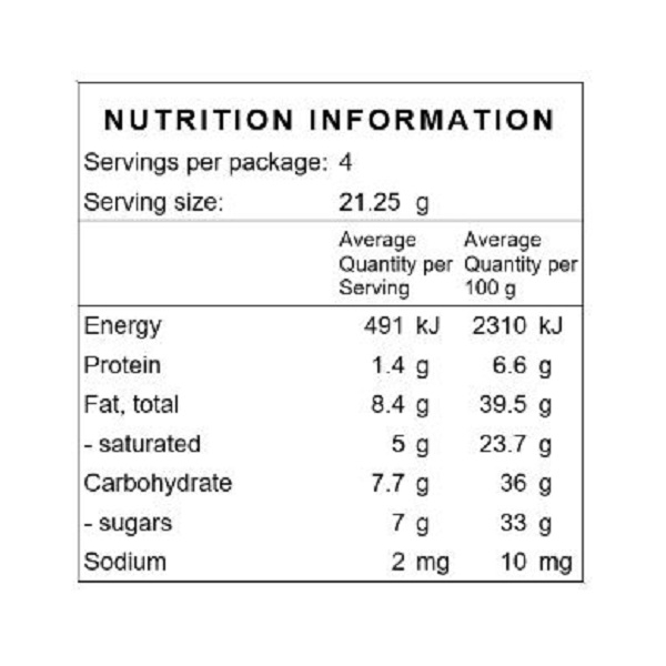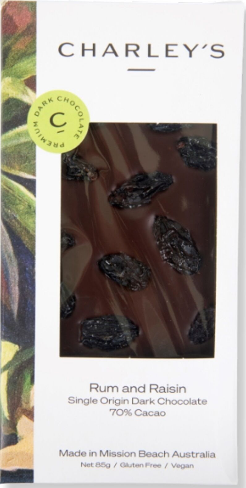 Dark Chocolate (95%). (Cocoa beans (PNG), Sugar (Australia), Cocoa butter (Venezuela or Peru), Soy Lecithin (Germany)). Rum infused raisins (Raisins (Australia), Rum (Australia)).
