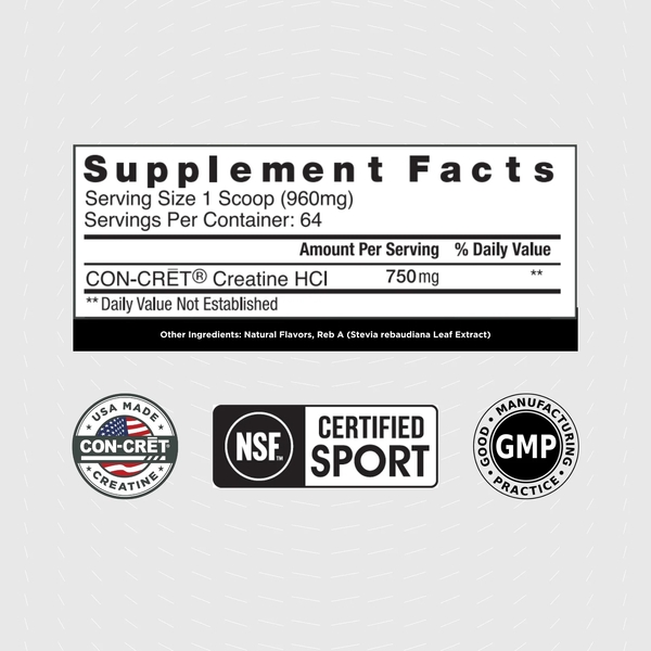 Patented Creatine HCl®, Natural Flavors, Reb A (Stevia rebaudiana Leaf Extract).